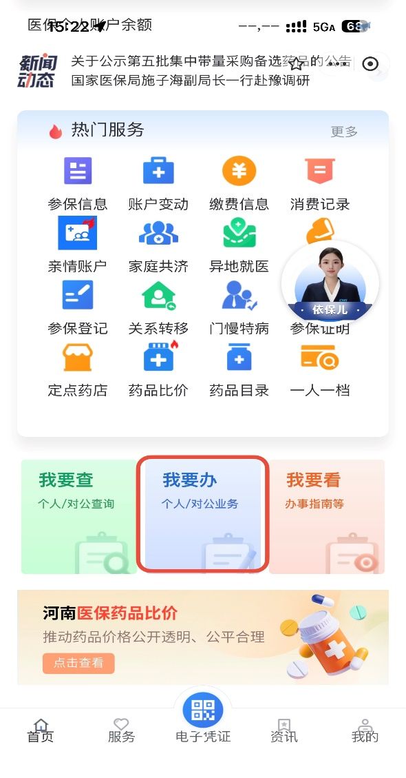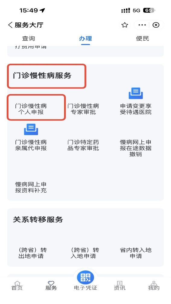 3.进入“我要办”模块,下滑页面找到“门诊慢性病服务”,点击“门诊慢性病个人申报”。