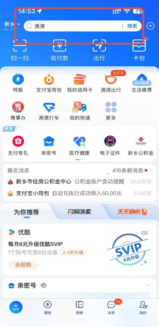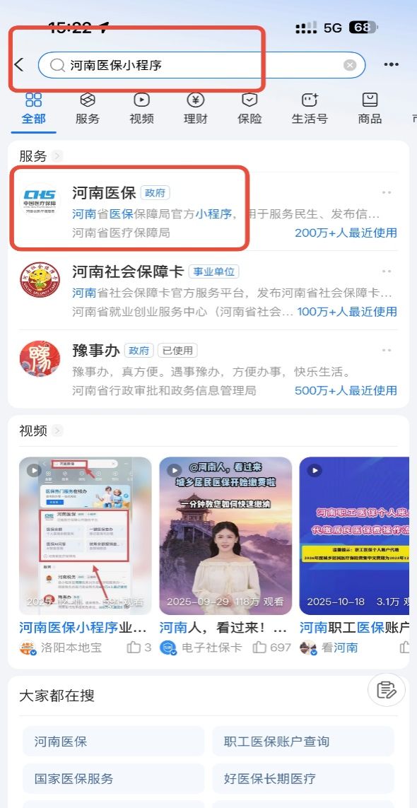 1.打开支付宝,在顶部搜索框输入“河南医保小程序”。